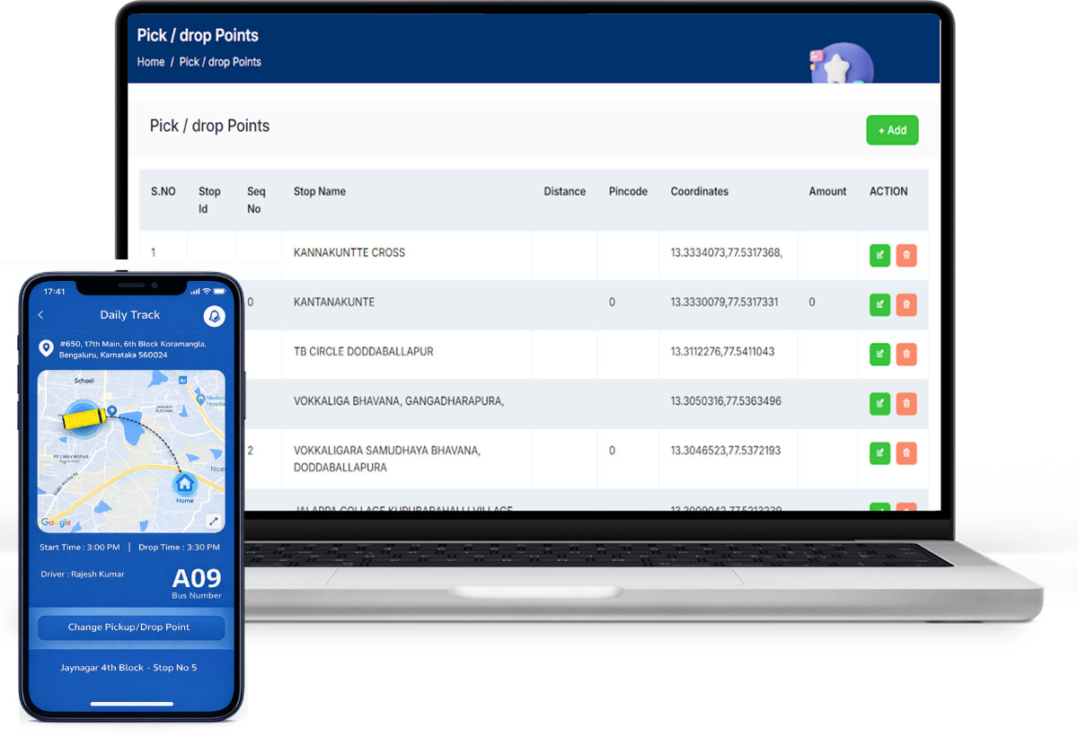 The smart bus tracking system takes out the daily stress of tracking the bus movement for pick up and drop by students and parents. Student attendance and the record of boarding the bus and drop is a critical safety feature. The real time tracking unifies the driver, the attender, the transport department enabling them to make any last minute changes and timely operational decisions. Also manage a fleet of buses, logistics planning, driver and attender alignment with routes, vehicle documentation, maintenance schedule