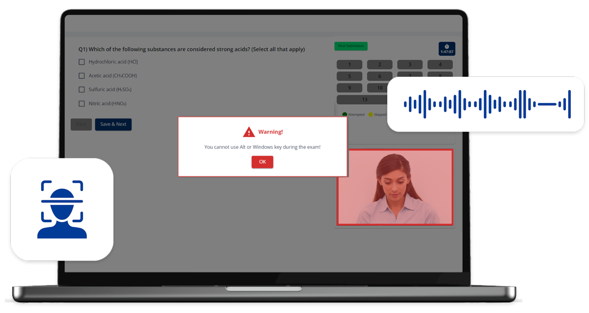 This AI powered advanced online assessment system enables fair conduct of an examination. When integrated with any of the core platforms it enables carrying out online examinations of all candidates effectively. The built in system alert captures and informs the examiner of any deviation by the examinee. Identity validation, mandatory webcam on, face recognition, screen lock, browser check, sensors for movement and audio leaves little room for any malpractice.