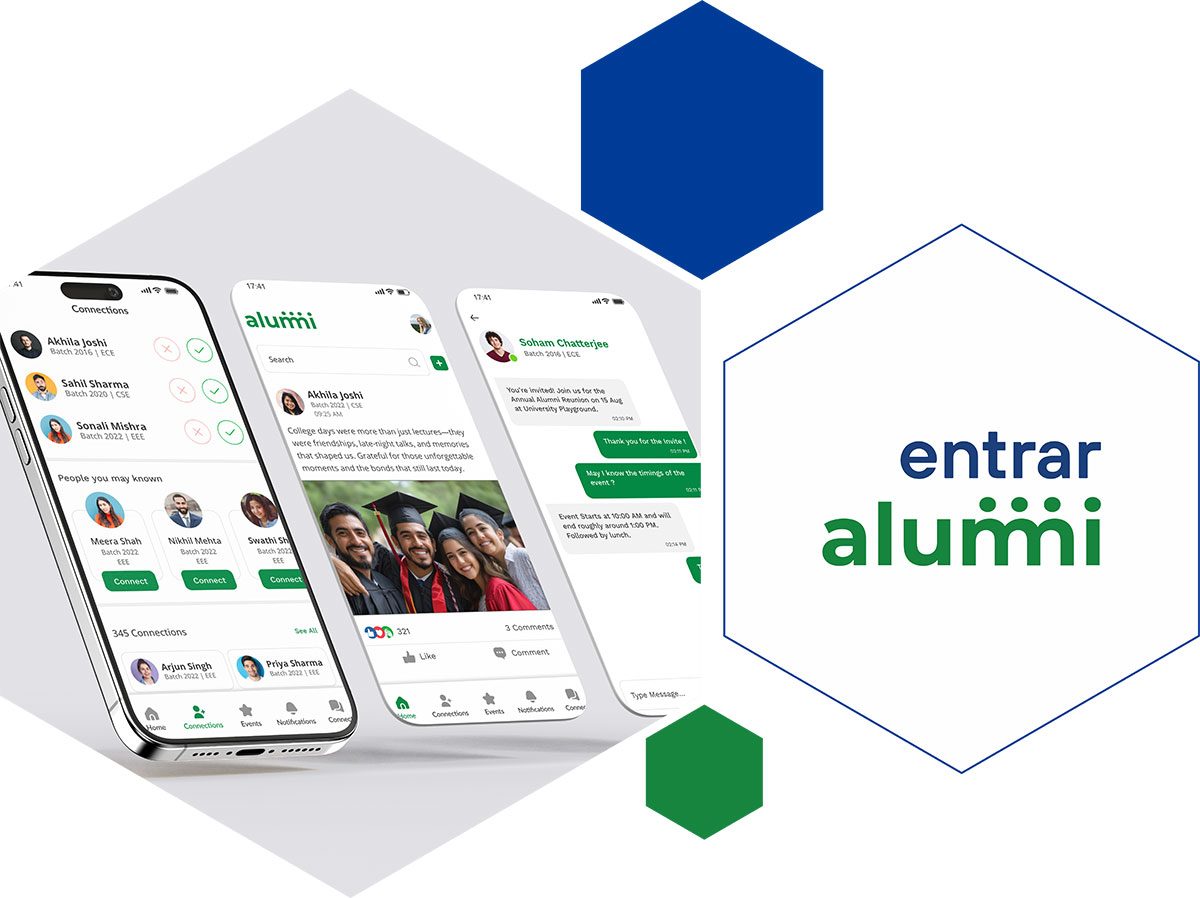 A standalone platform for managing the alumni. A dedicated app compliments the admin dashboard and when integrated with entrar @School or University School management it makes the journey of the student seamless from schooling / graduation to career and beyond. Besides being the institution’s official platform for reconnecting the alumni spread nationally and globally.