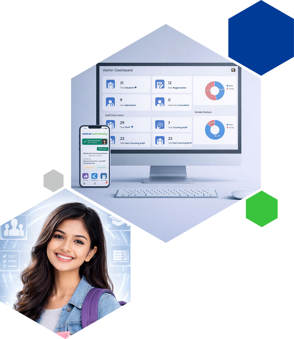 Entrar University Management Platform comes with a range of modules, deep functionality, distinct UI experience, dedicated student and faculty app. Unified Dashboard for everything needed during the academic years by every student. It is customizable to the unique requirement of higher education institutions.